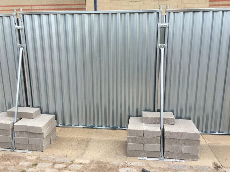 Support braces include stabilizers and block-trays. The stabilizers are connected directly with the fence panel and block trays. And you can add ballast on the block tray to improve the ability of withstanding strong wind. Through testing, wind loading rating of our temporary hoarding system can reach up to 70 mph.